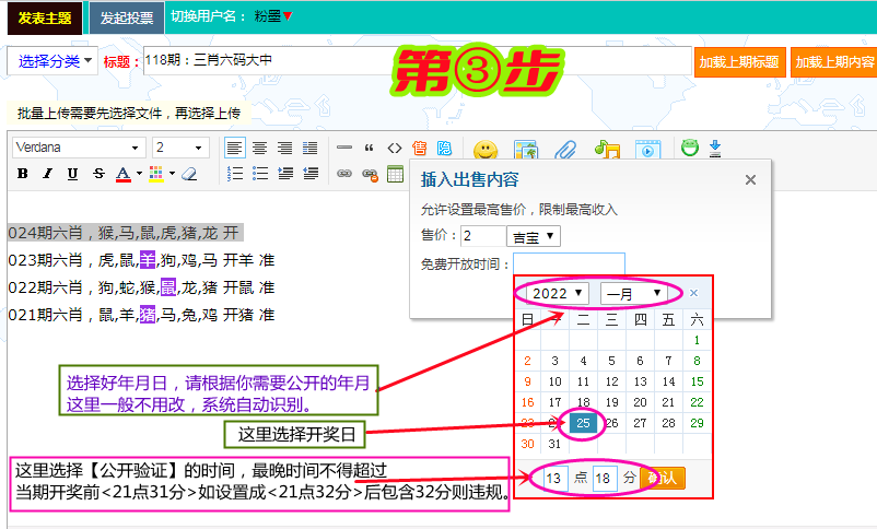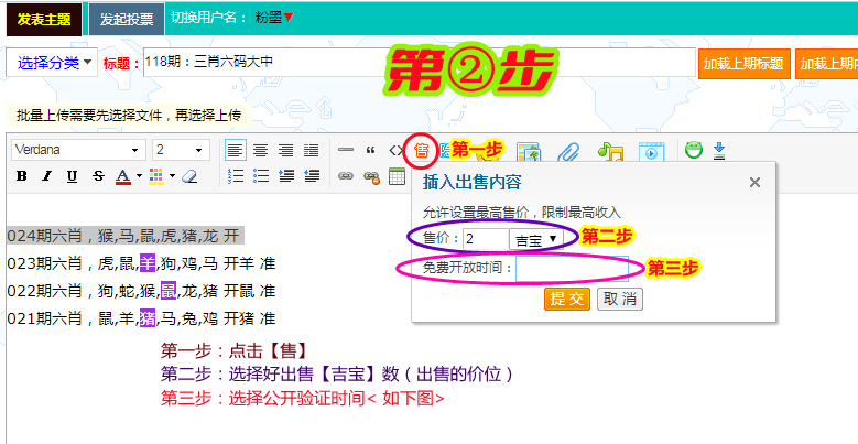 第三步: 按照以下图片参考步骤进行操作即可;特别注意在设置出售价以及公开验证时间的正确操作,否则一切后果由发表者承担!